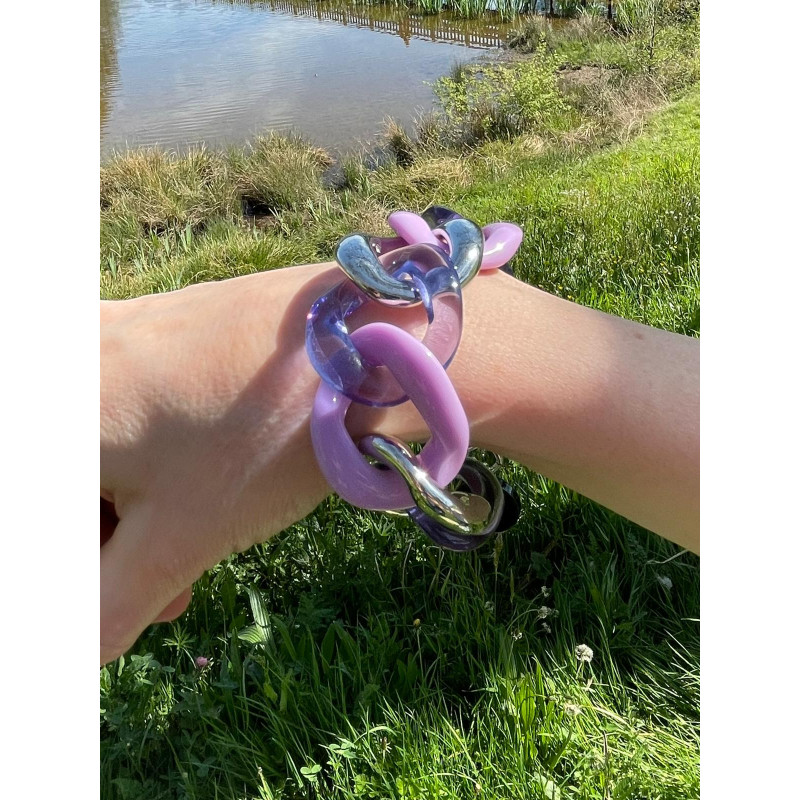 Bijou en résine avec chaîne de réglage en laiton gris et finition en acétate de cellulose.