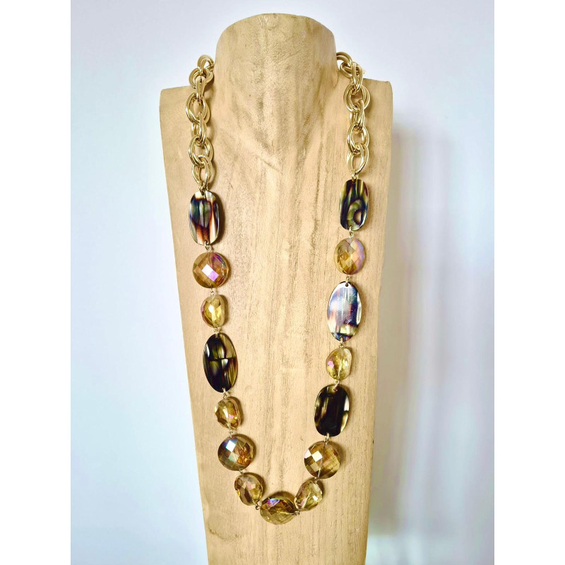 Bijou en Acétate de cellulose, cristal et laiton doré à l'or fin, finition en acétate de cellulose.
