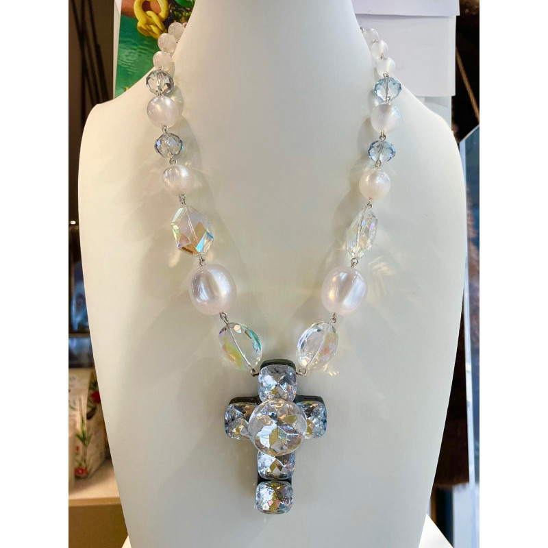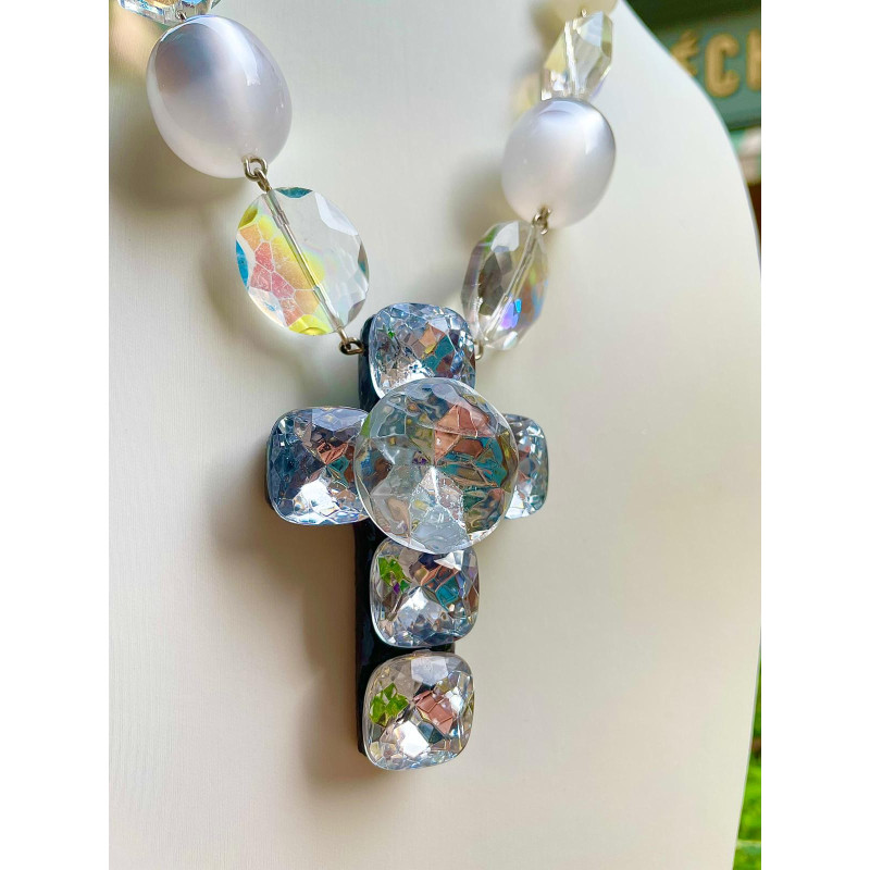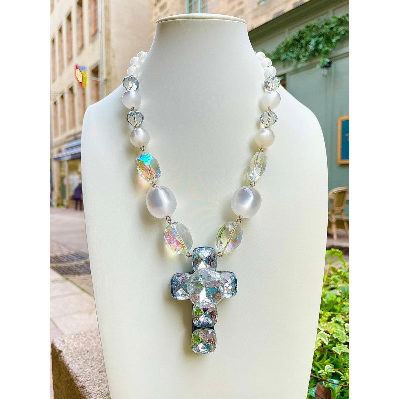 Bijou en cristal, résine et laiton rhodié, finition en acétate de cellulose.
