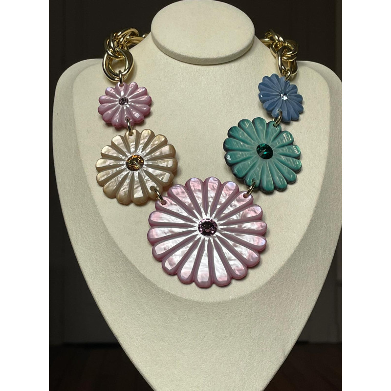 Bijou en résine, cristal et laiton doré à l'or fin, finition en acétate de cellulose.