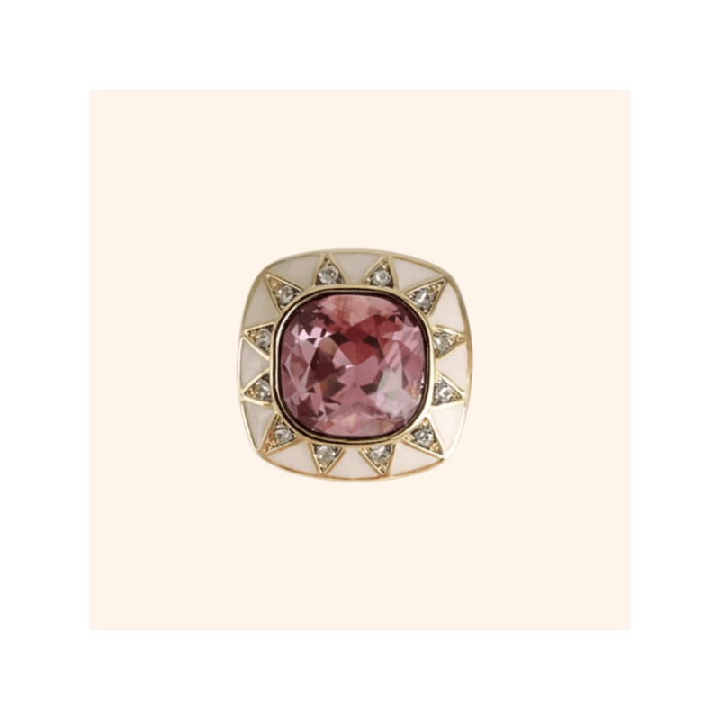 Au centre du bijou, une pierre rose inspiration morganite, taillée en forme carrée et finement facettée, capte la lumière avec douceur. Sa teinte rosée légèrement poudrée évoque la délicatesse minérale de la morganite, offrant un éclat feutré, subtil et élégant. Autour de cette pierre centrale, un motif rayonnant serti de strass dessine une couronne graphique qui structure le bijou et renforce son caractère joaillier.