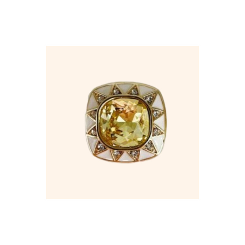 Au centre de ce bijou de bouton, une pierre couleur citrine, taillée en forme carrée et finement facettée, capte la lumière avec intensité. Sa teinte chaude et lumineuse évoque la chaleur d’un soleil doré, apportant éclat et relief à la tenue. Autour de la pierre centrale, un motif de rayons solaires sertis de strass dessine une couronne lumineuse, renforçant l’effet précieux et la sophistication du design.