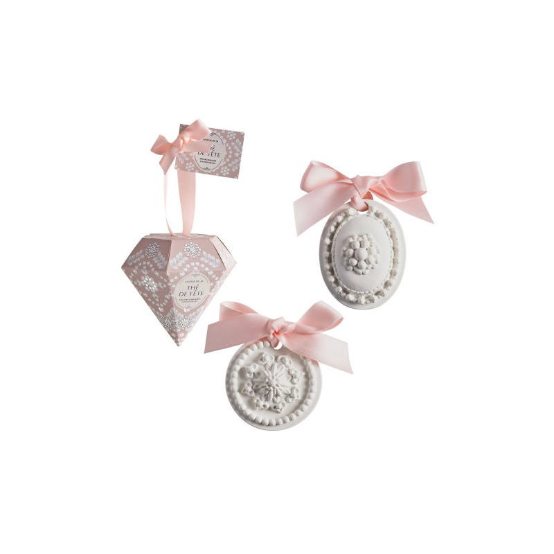 Surprenez vos invités ou faites simplement plaisir à l'un de vos proches avec ce joli coffret Surprises Fête Nacrée. Il renferme deux décors en plâtre parfumé entièrement réalisés à la main. Il est idéal pour parfumer délicatement et pour longtemps tous les petits espaces de votre maison comme les armoires, tiroirs ou bagages.
