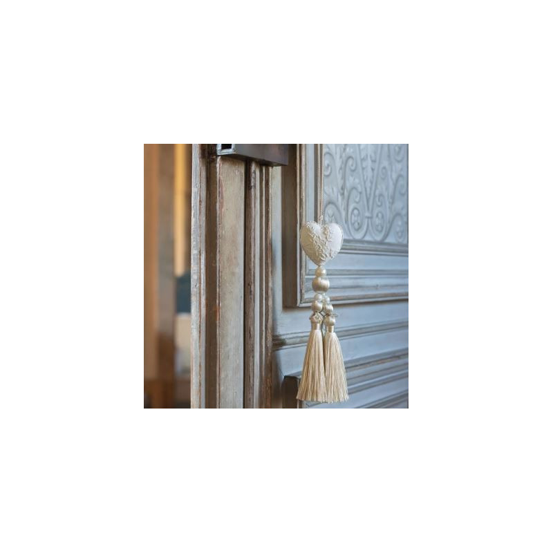 Inspiré des plus belles passementeries, ce somptueux pompon orné de perles et d'un décor en plâtre parfumé minutieusement ciselé à la main, diffuse sa douce senteur partout où il est suspendu : aux poignées de portes, de tiroirs ou encore d'armoires.
