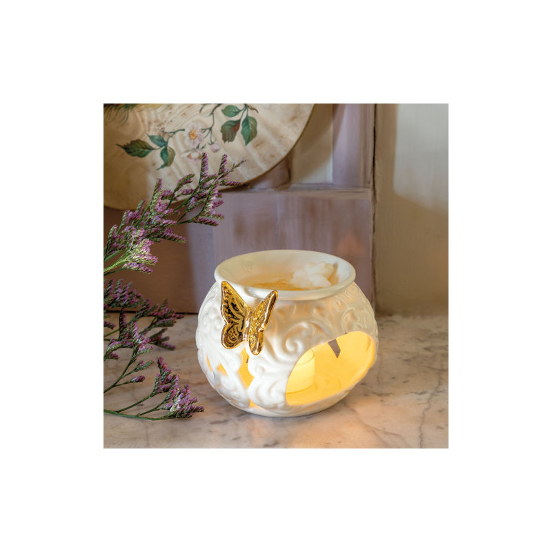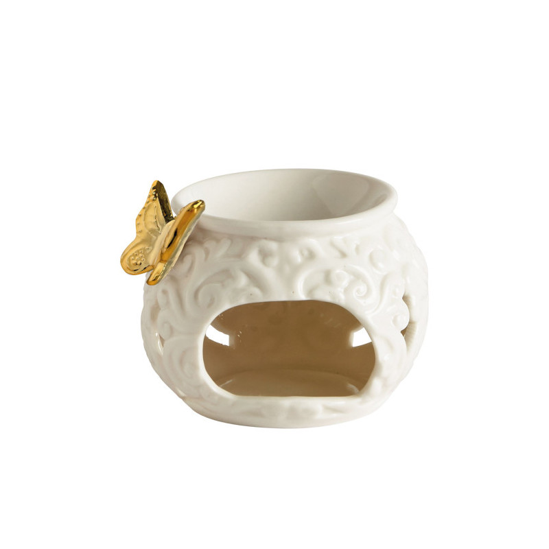 Craquez pour le charme délicat du brûle-parfum Papillon en céramique blanche. Finement ajouré de motifs arabesques, il est sublimé par un élégant papillon doré qui apporte une touche précieuse et poétique à la décoration.