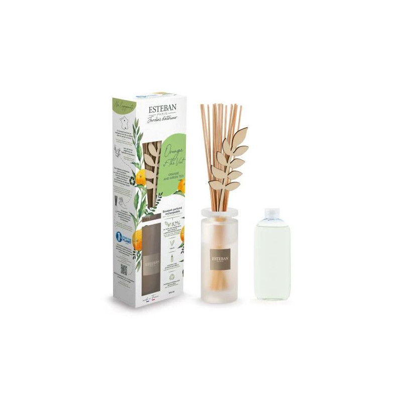 Orange et Thé vert, c’est une explosion d’agrumes où l’huile essentielle d’orange se mêle aux effluves de thé vert pour un éveil sensoriel.