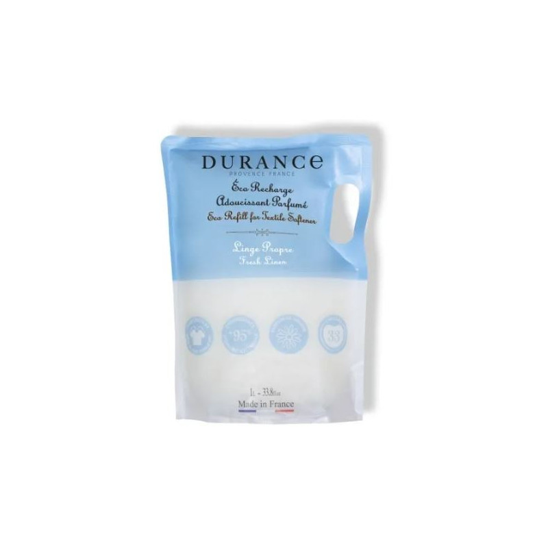 Rechargez votre flacon d'adoucissant en plastique recyclé, 100% recyclable Durance grâce à l'éco recharge adoucissant linge propre qui apporte douceur et souplesse à vos textiles tout en les parfumant délicatement.