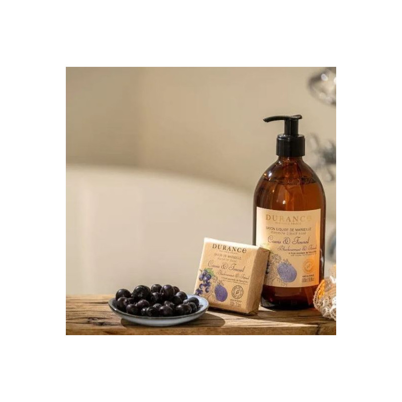 Le savon liquide de Marseille Cassis & Fenouil pour le corps et les mains, fabriqué en Provence, nettoie la peau en douceur. Composée de 98% d'ingrédients d'origine naturelle, sa formule est à base de concentré de savon de Marseille, préparé avec de l'huile d'olive bio de Provence au chaudron selon la recette traditionnelle, et contient également de l'extrait de riz rouge de Camargue et de la glycérine.