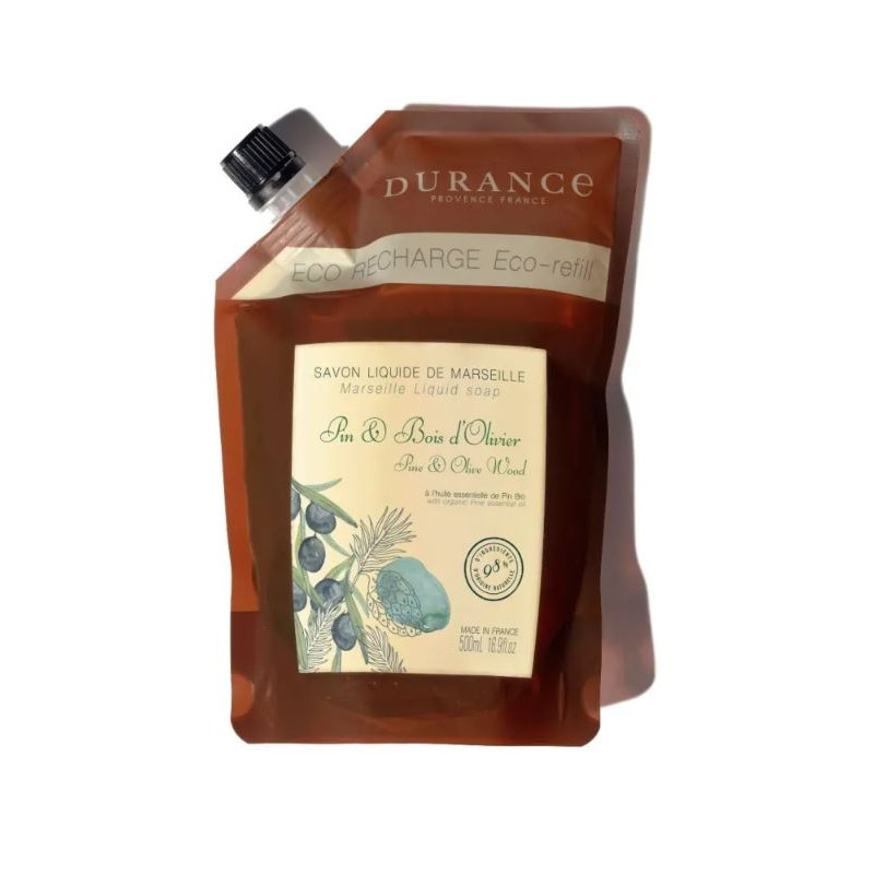 La recharge savon liquide de Marseille Pin & Bois d'Olivier rechargera votre flacon en verre ambré de savon liquide pour le corps et les mains.
